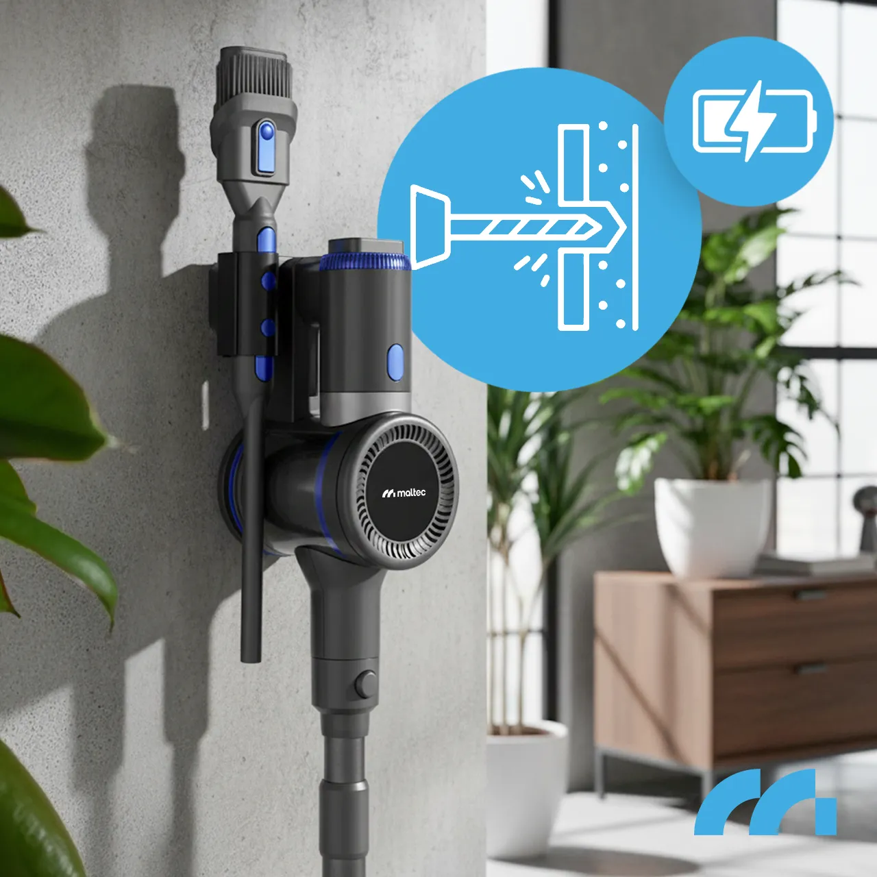 Sada obsahuje nástěnný držák (dokovací stanici) , který umožňuje bezpečné a úhledné uložení vysavače. Díky tomu je zařízení vždy po ruce a připravené k použití a váš domov zůstane uklizený.