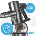 Vysavač nepotřebuje sáčky – je vybaven nádobou na prach a cyklonovým systémem, který vytváří vířivý proud vzduchu. To umožňuje efektivní oddělení nečistot od čistého vzduchu a jeho nasměrování do nádoby.