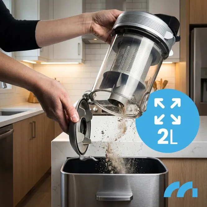 Vyprazdňování vysavače nebylo nikdy tak snadné a příjemné! Jednoduše jej umístěte nad koš a uvolněte zámek na nádrži, abyste ji otevřeli a vyprázdnili obsah.