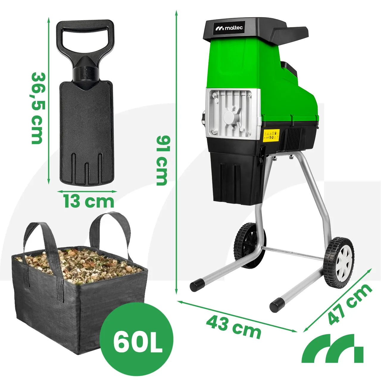 Drtič se dodává s 60litrovým vakem, ochrannými rukavicemi a posunovačem. To znamená, že se nemusíte starat o další příslušenství – vše, co potřebujete k zahájení práce, je součástí jednoho kompletního balení.
